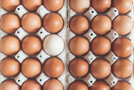White Egg close up view in the eggs tray with a rows of brown color eggs. Personal individuality or leadership concept image.