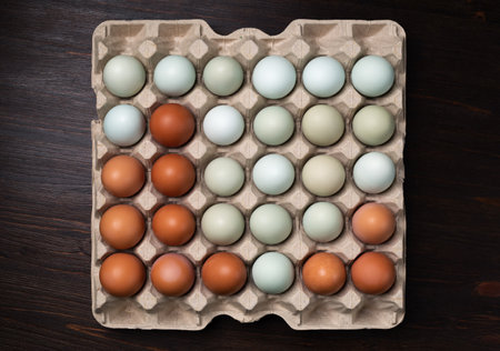 top view of brown eggs in a in a cardboard packaging tray in a symmetrical arrangement by gradient colors