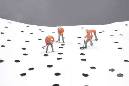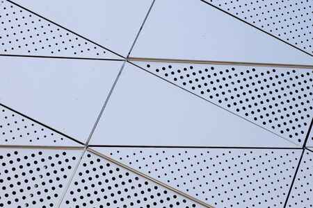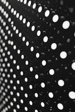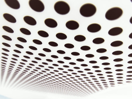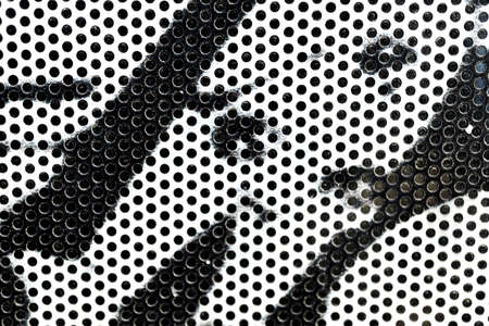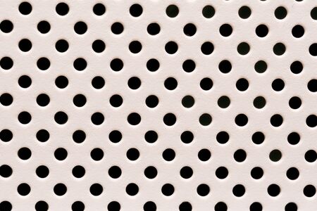 Rapid black big dot pattern on white background, round holes texture on perforated metal panel surface, angle view.