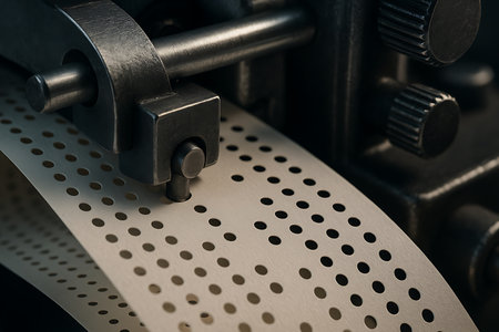 A close-up view of a vintage data processing machine, showcasing the intricate mechanism feeding a perforated paper tape with its pattern of holes. This image captures the essence of early computing technology, industrial innovation, and historical data storage methods.