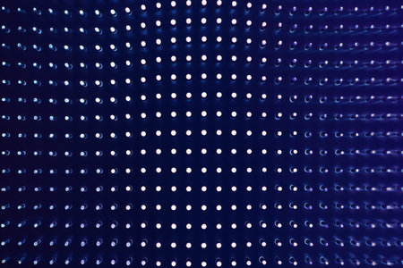 A close-up image of a blue surface with a repeating pattern of circular holes that reveal a yellow background.