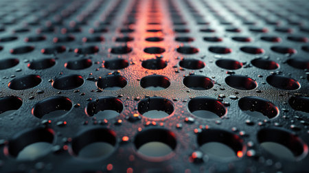 Detailed view of metal grate with small drops of water dispersed across its surface.