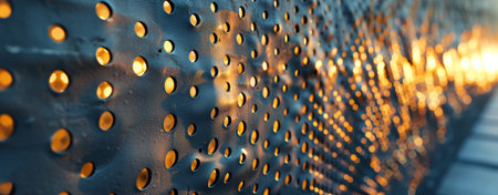 Abstract golden light shines through perforated metal sheets, creating a bokeh effect. The lines of light and shadow form an interesting abstract pattern with metallic tones.