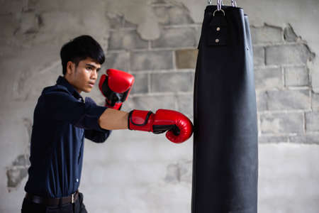 Man breaking through red paper with boxing glove, closeup