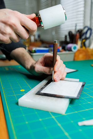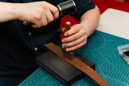 Crafting belt holes with punch tool on leather strap. Punching and detailing leather belt holes. Artisan punching holes into a leather strap for a handmade belt on a green cutting mat