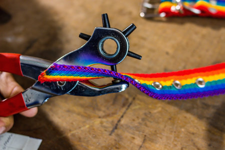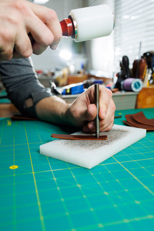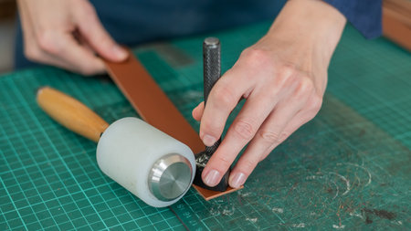 Punching and detailing leather belt holes. Artisan punching holes into a leather strap for a handmade belt on a green cutting mat. Crafting belt holes with punch tool on leather strap