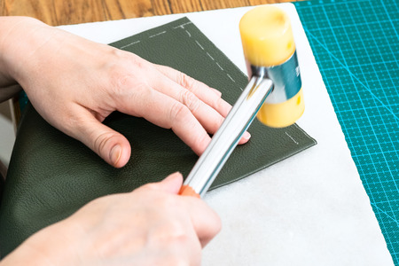 Hands of a professional craftsman make a leather wallet new, clean genuine leather wallet, close-up cropped shot.