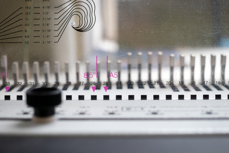 Hole punch and stacks of colorful paper on the table in the office.