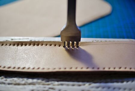 Leather working four prong chisel hole punch close up. Punching holes for stiching with metal tool. Selective focus.