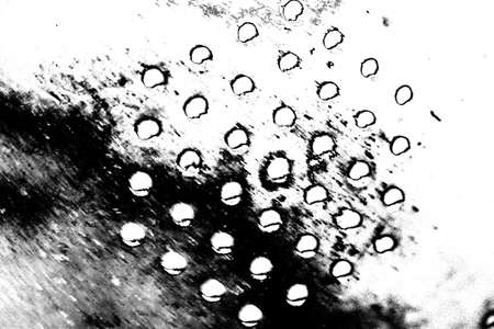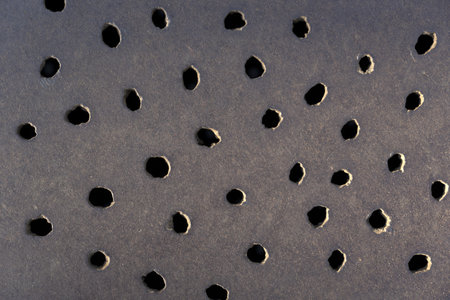 Round black holes in an old metal surface close-up. Selective focus. Abstract background.