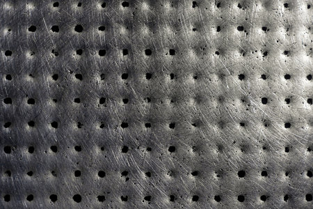 abstract background of a perforated metal plate with holes.