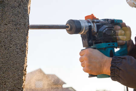 male hands of a construction worker drills a hole in concrete with a hand drill. the process of drilling holes in concrete beams and crossbar for various fastenings using an impact drill.