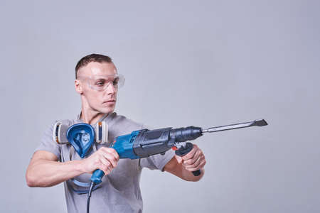 workman with a rotary hammer. worker, professional with hammer drill perforator. copyspace.