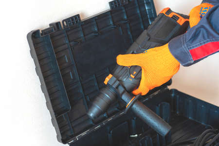 Hands in protective gloves hold a rotary hammer. worker, professional with hammer drill perforator.