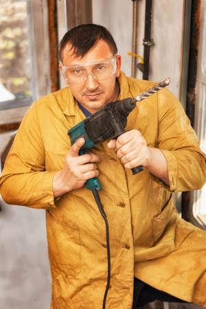 Master Builder-finisher in work clothes, with a perforator in his hands for any purpose