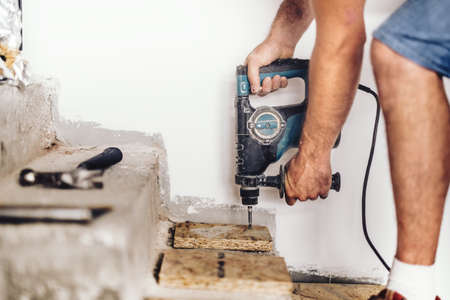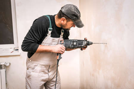 A male installer works with a hammer drill. Construction works.