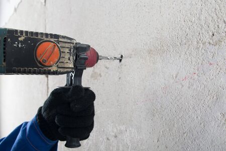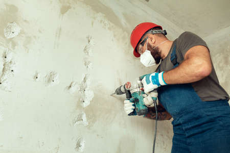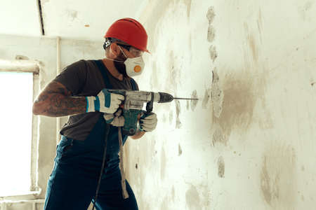 Builder worker man with hammer drill perforator equipment making hole in gray wall construction