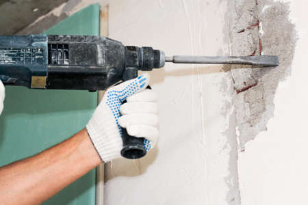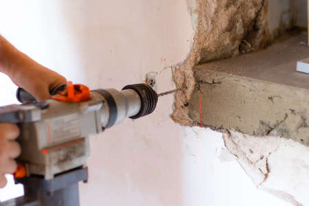 close-up of drilling machinery on construction site. handyman using a jackhammer drilling machine to make holes in concrete interior walls