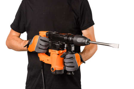 Male hands in protective gloves holding new big electric perforator with long drill and handle at isolated white background
