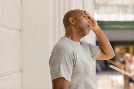 Portrait of a tired man resting his forehead on his hand outdoors in the evening light