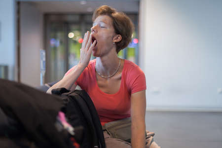 Exhausted corporate man yawns during work. Fatigue, overwork, and lack of energy in daily business environment.