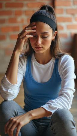 A young woman with a headband sits pensively, her hand resting on her forehead, surrounded by a warm, rustic brick backdrop. The image captures a moment of introspection, highlighting her emotional depth and the serene atmosphere of the space.
