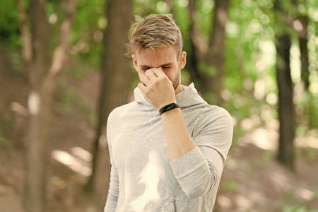 Man jogger stop running in park because of headache or nose bleeding. Runner with pedometer band finished training because of pain. Man runner workout outdoor feel pain