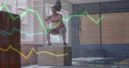 Image of graph processing data over caucasian woman jumping on box cross training at gym. Fitness, exercise, strength, data, digital interface and technology digitally generated image.