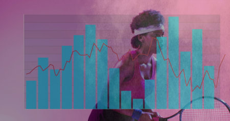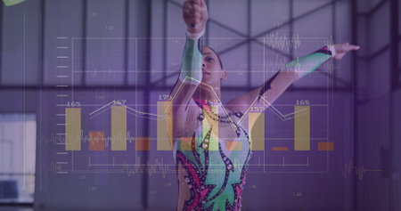 Image of financial data processing over caucasian female gymnast. Global sports, active lifestyle, connections, computing and data processing concept digitally generated image.