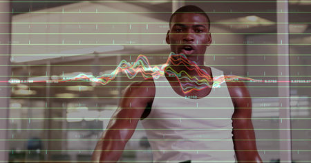 Image of data processing on graph over diverse male group relaxing after cross training at gym. Fitness, exercise, strength, data, digital interface and technology digitally generated image.