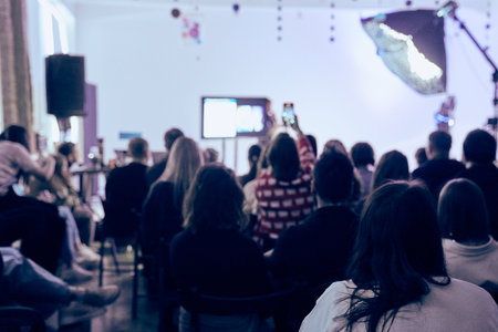 blurred image of the audience and media representatives at a briefing in the conference room