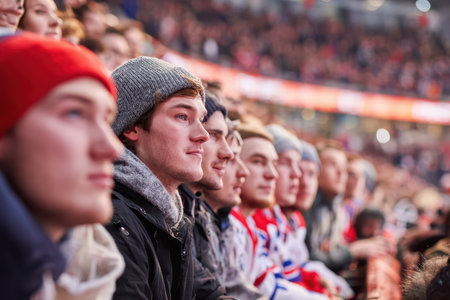 Crowd of enthusiastic fans cheering at a hockey match in a vibrant arena during a thrilling game atmosphere in winter season