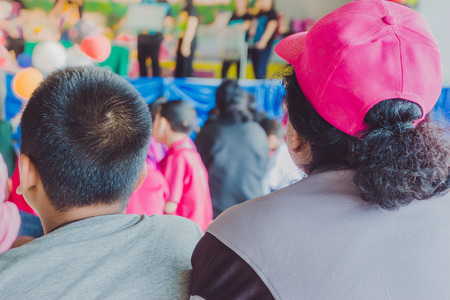 Parents are taking pictures and waiting to give gifts to their children after show on stage in school.