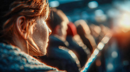 Side profile of a young woman standing in a crowd during sunset, with warm backlighting.