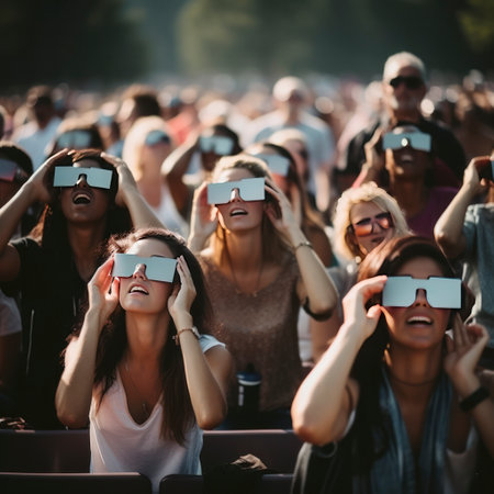 crowd of people watching eclipse through dark glasses