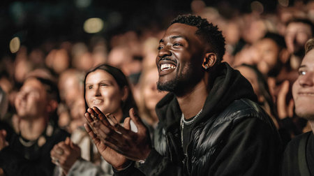 A joyful audience member shows excitement while clapping at a live music concert, surrounded by a vibrant crowd enjoying the performance.