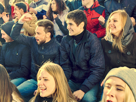 Fans cheering in stadium people applaud your favorite team and singing on tribunes. Group youth group support your favorite team. Happy young people outdoors.