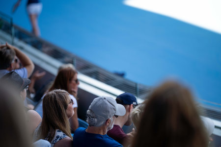 Group of spectators in stadium, focused on game. Person in foreground has light brown hair and wears black jacket, crowd in background blurred. Concept of championship, victory, match. Ad