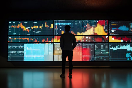 Businessman analyzing competitor data on a large screen while immersed in a dark room, focusing on strategies for market success