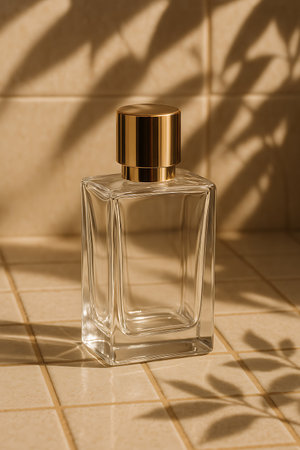 A clear glass bottle with a gold cap sits on a tiled surface, lit by natural light and shadows.