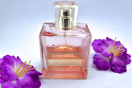 Fragrance and perfume template. Beautiful glass bottle with purple perfume on white rock. Concept of luxury perfumery.