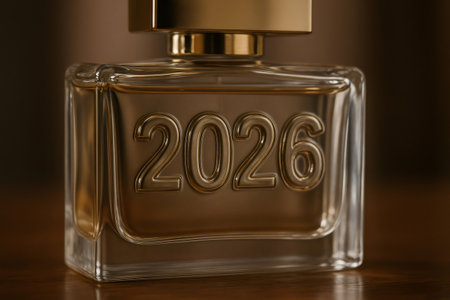 Elegant glass bottle displaying the year 2026, featuring golden details and a luxurious aroma concept
