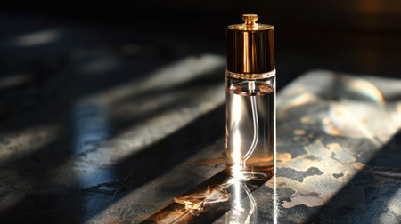 A beautiful glass perfume bottle sits elegantly on a smooth, reflective surface, illuminated by soft light creating captivating shadows and reflections.