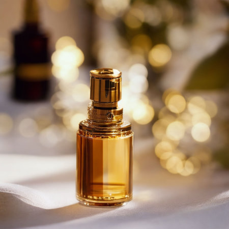 An AI generated illustration of a golden perfume on a white surface with yellow bokeh lights