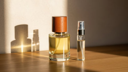 AI Generated. several bottles with perfume in rays of sunshine on wooden table