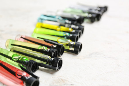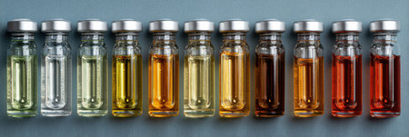 Liquid samples in lab containing medicine in glass vials and ampoules