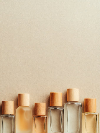 Elegant glass perfume bottles with wooden caps arranged neatly against a soft, textured background, showing their unique shapes and colors in good lighting.
