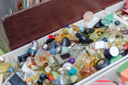 Glass perfume bottles based oils. A Bazaar, market. Macro. Gold and pink gamma
