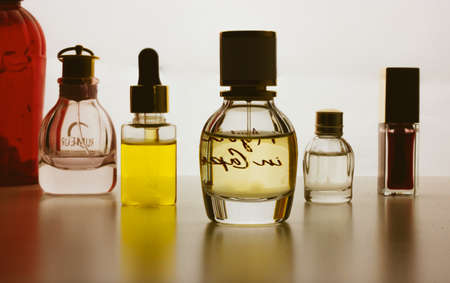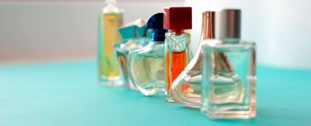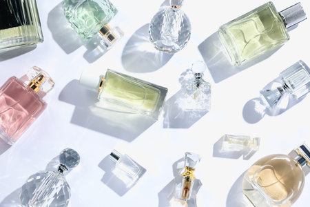 Different perfume bottles on white background. Perfumery, cosmetics.