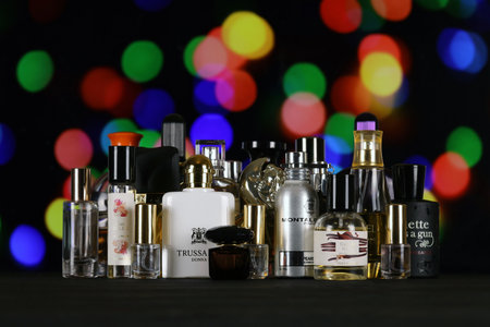 KHARKIV, UKRAINE - JANUARY 2, 2021 Many Fragrance perfume bottles of various famous brands of perfume manufacturers on dark noir background